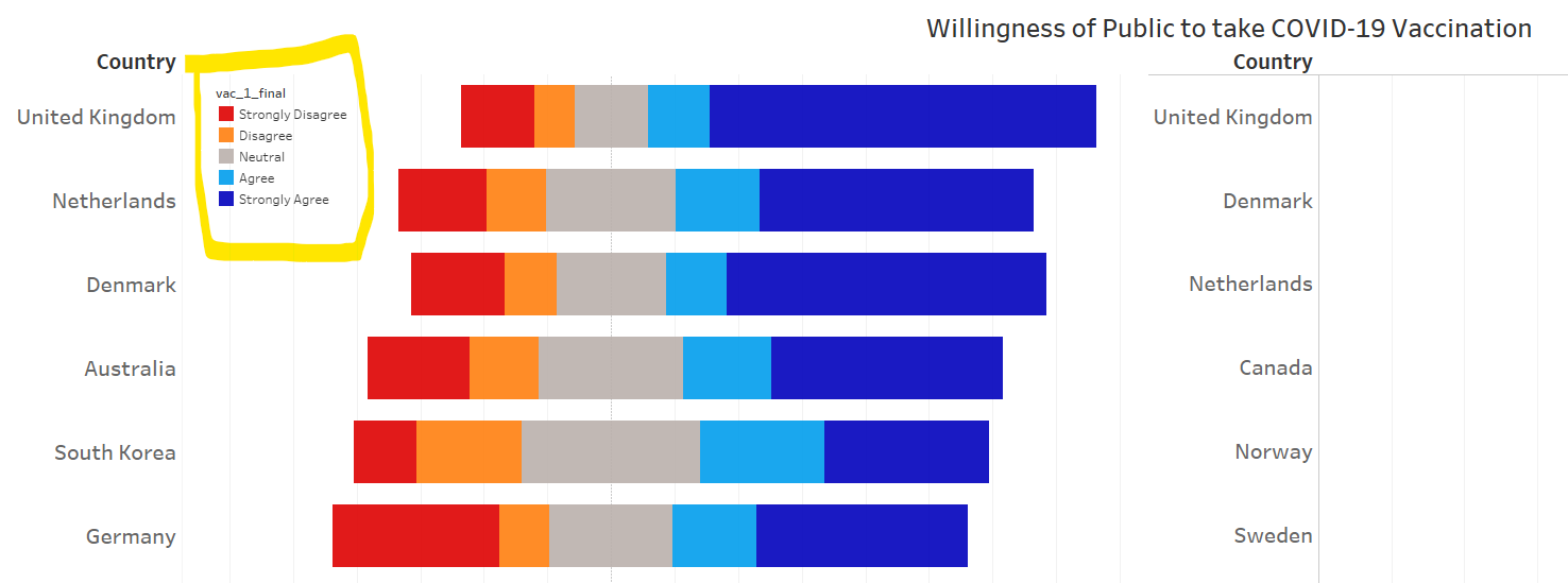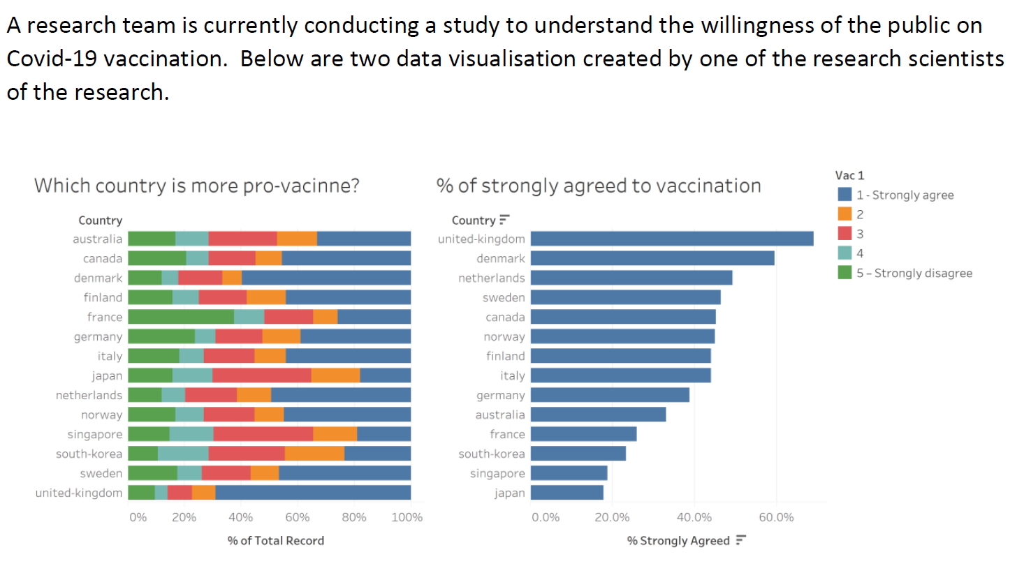 The titles of the charts are not well-worded. Firstly, the chart is intended to show the willingness of the countries’ residents to take the Covid-19 vaccination. This can easily be misunderstood, because the title “Which country is more pro-vaccine?” could be easily misconstrued as an indication of the political landscape in the country instead of the sentiment of the people. Secondly, this is a result of polling a sample of the countries’ populations. Therefore the title should NOT be driving the message that these are the results for the entire country. This applies to both titles.