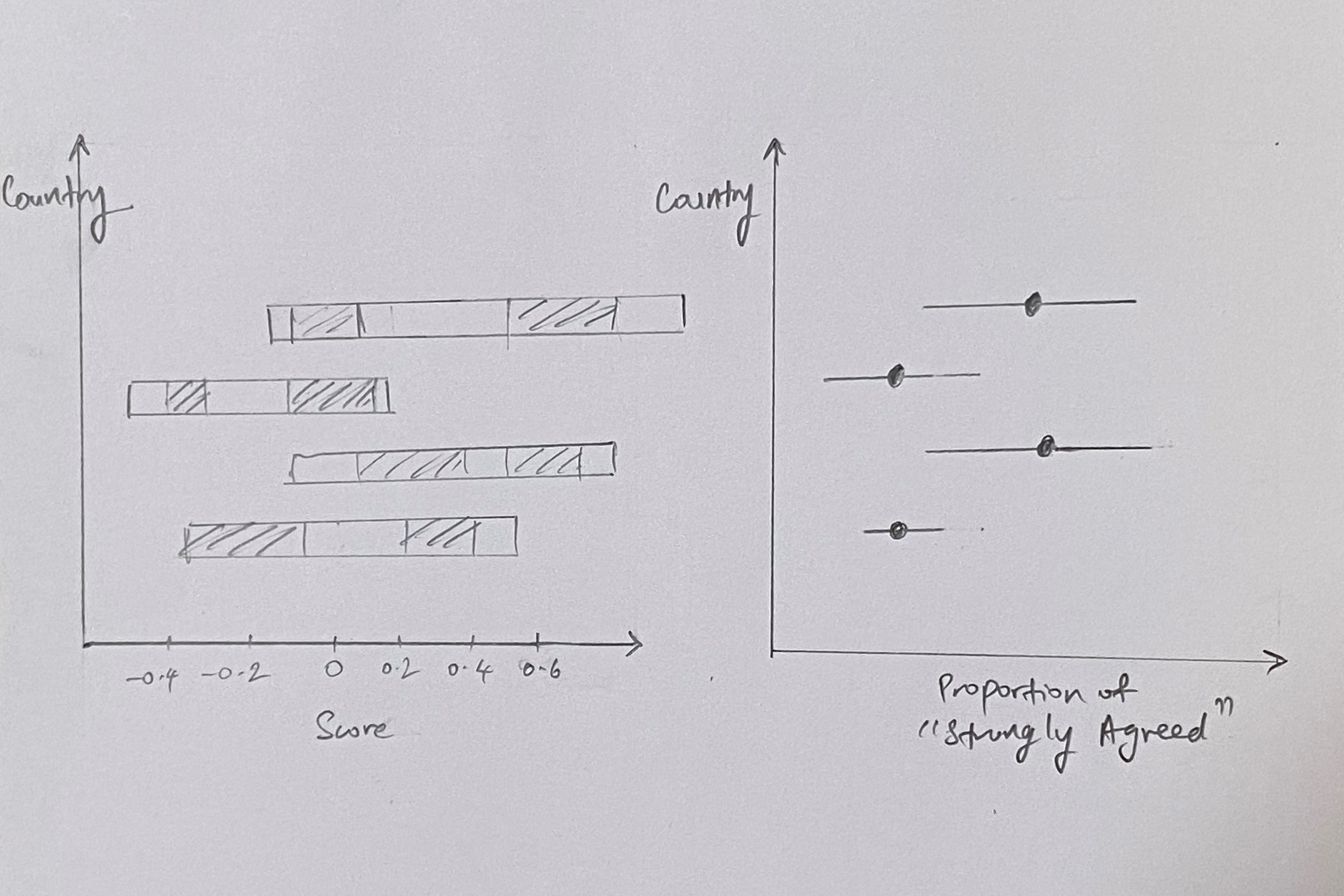 The chart on the right is providing a subset of information that already exists in the first chart on the left. However, due to how the countries have been sorted differently in both charts, this is not apparent. Therefore in its current state, the chart on the right is essentially redundant if the stacked bar chart (left) was neatly sorted in descending order of “Strongly Agree” proportions with a clear legend.