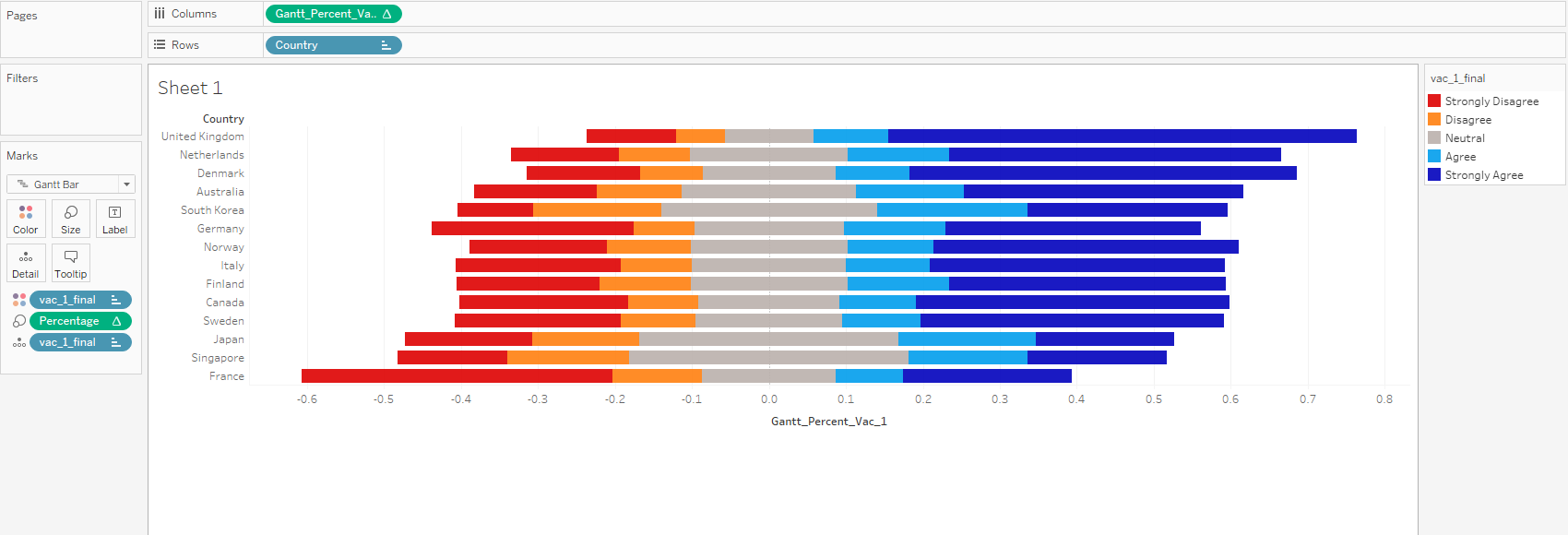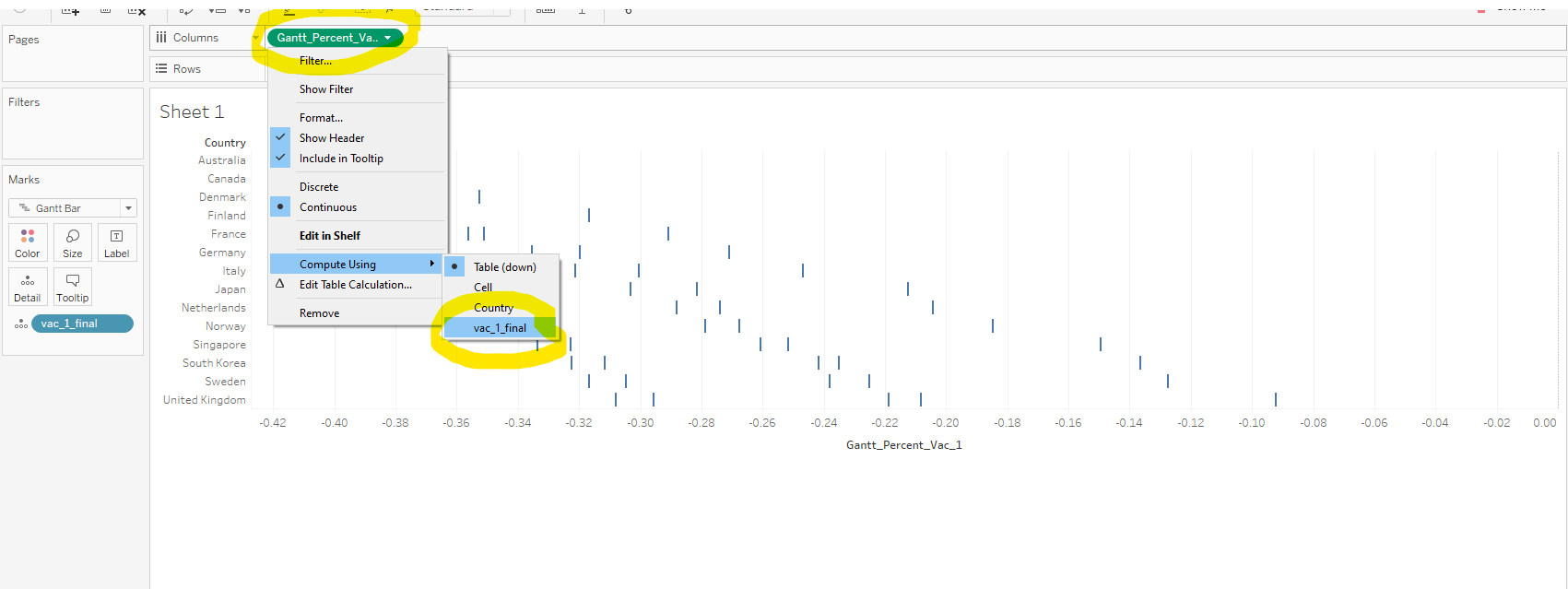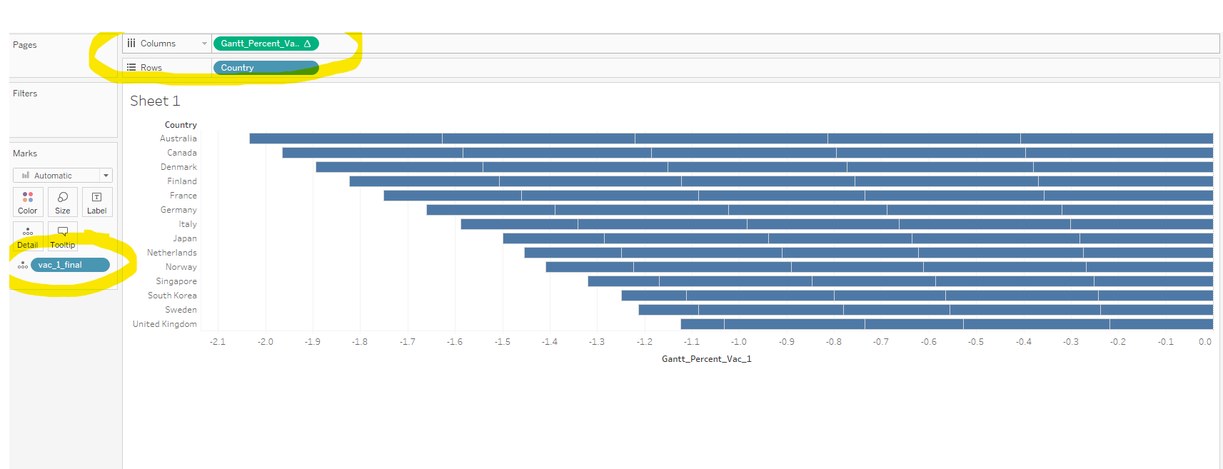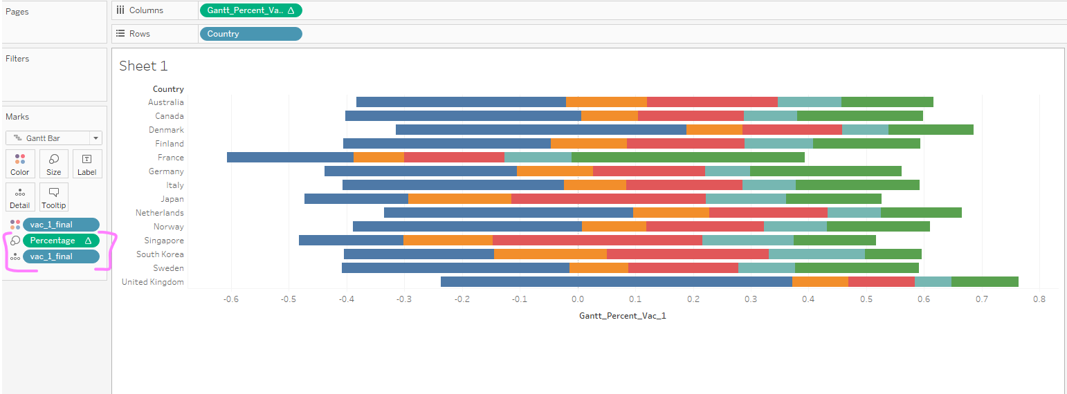 Drag the “Gantt_Percent_Vac_1” field into Columns and the “Country” field into Rows, followed by adding “vac_1_final” to the detail level as shown here: