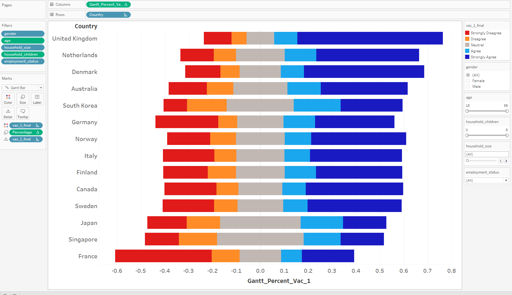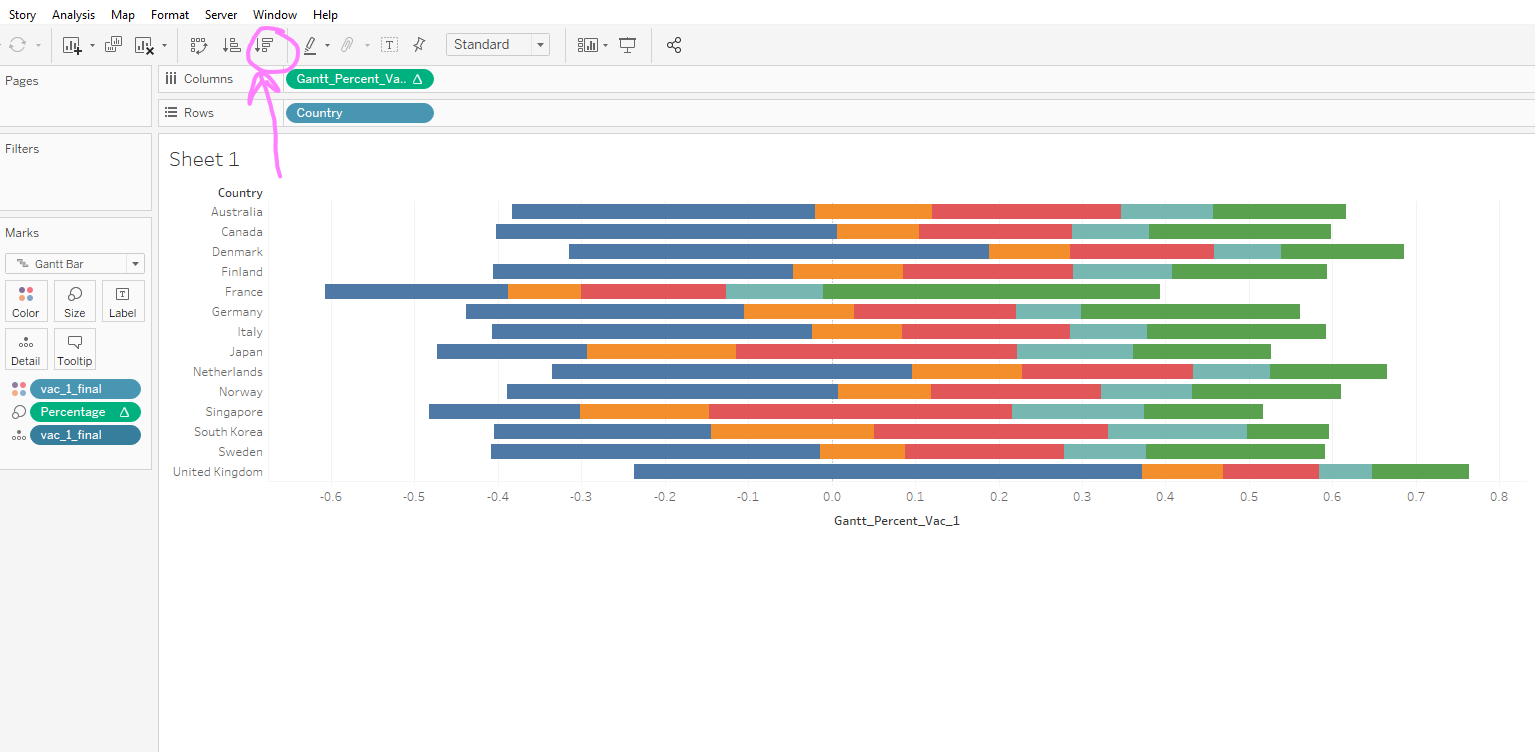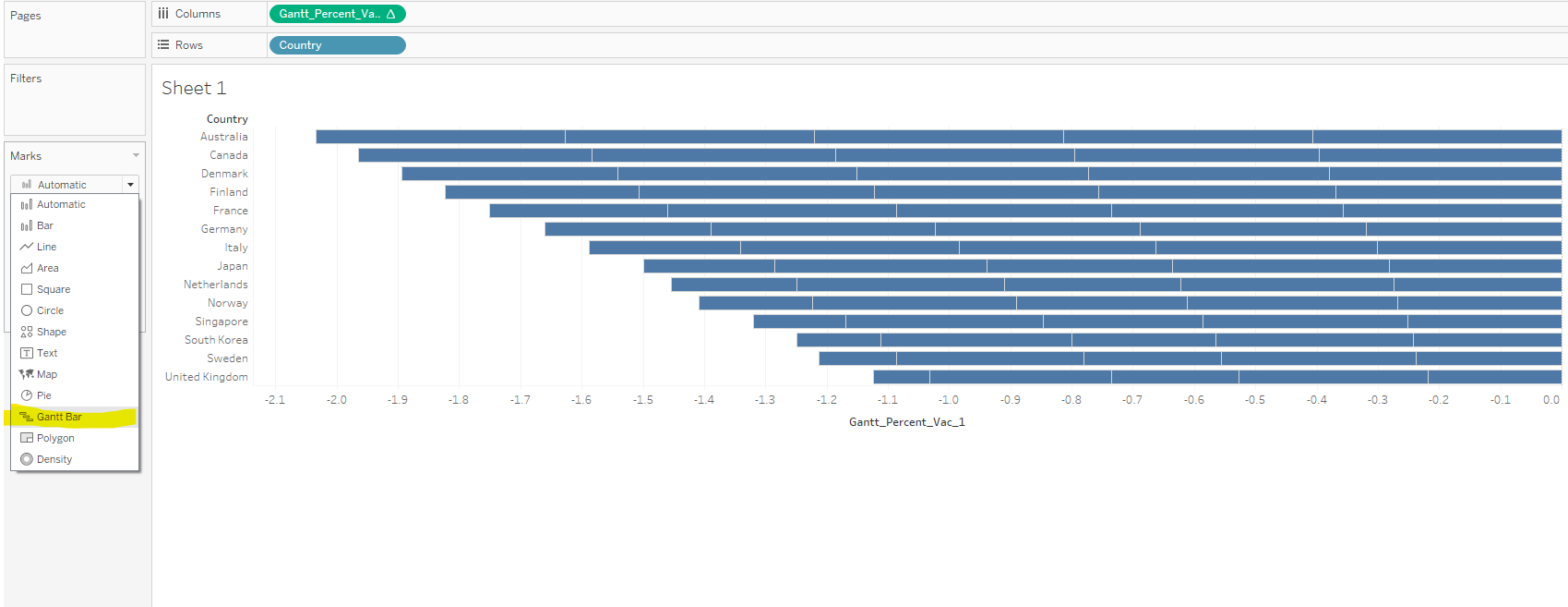 Drag the “Gantt_Percent_Vac_1” field into Columns and the “Country” field into Rows, followed by adding “vac_1_final” to the detail level as shown here: