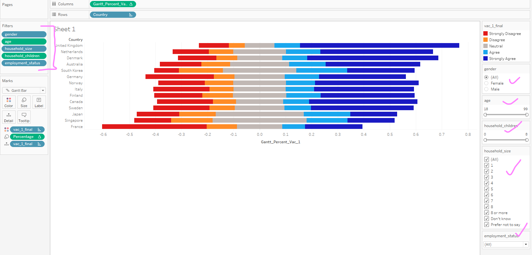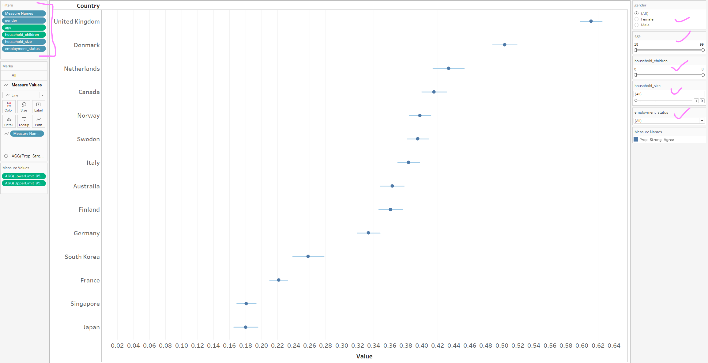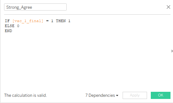 Strong_Agree - We need to create a field to identify which rows in the data set we are taking for the error bar, in this case these are all the responses for “Strongly Agree” across all countries, therefore we need to mark all vac_1_final entries of value “1”: