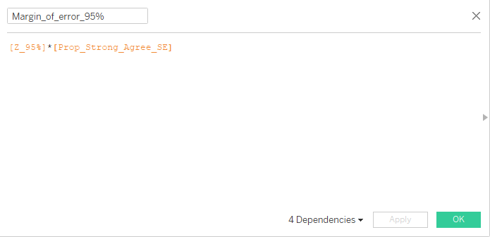 To show the confidence intervals in an error bar chart, there are several calculated fields we need to create. For all calculated fields, we go to the Sheet Page –> “Analysis” –> “Create Calculated Field”, and then type in the formulas: