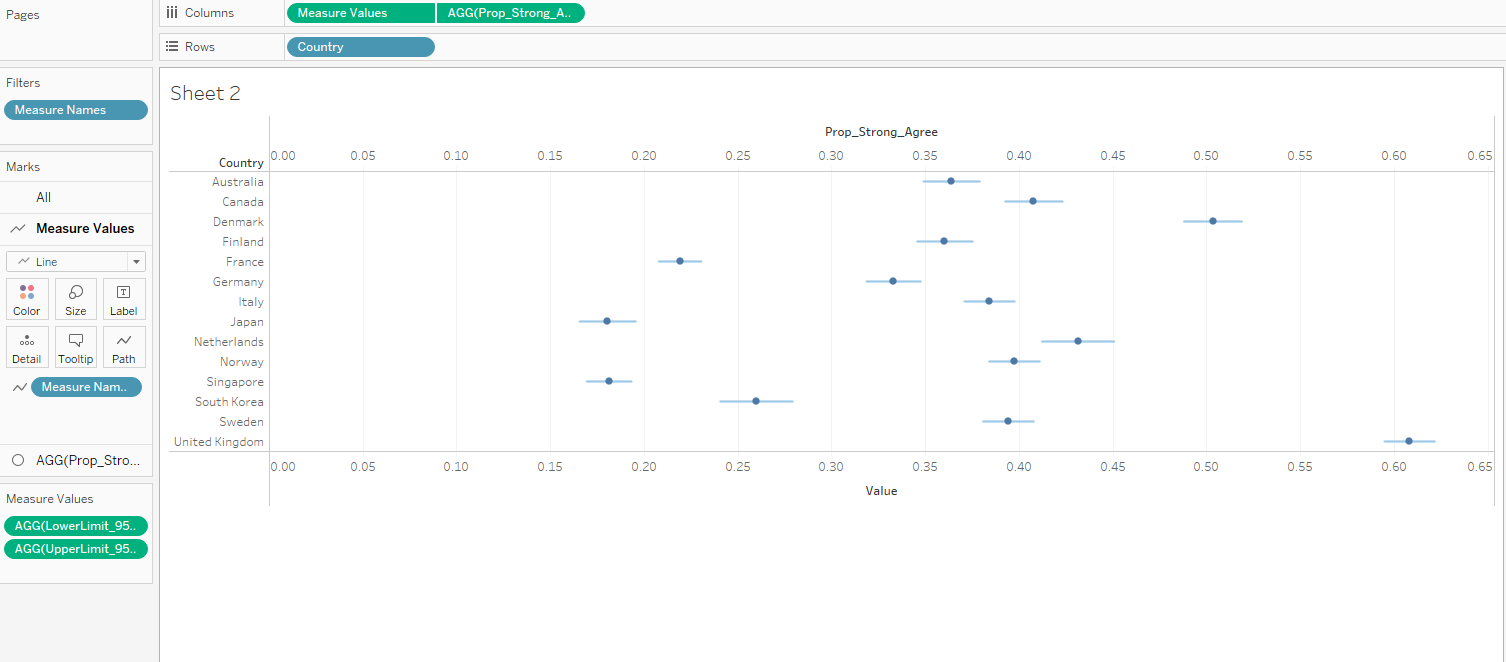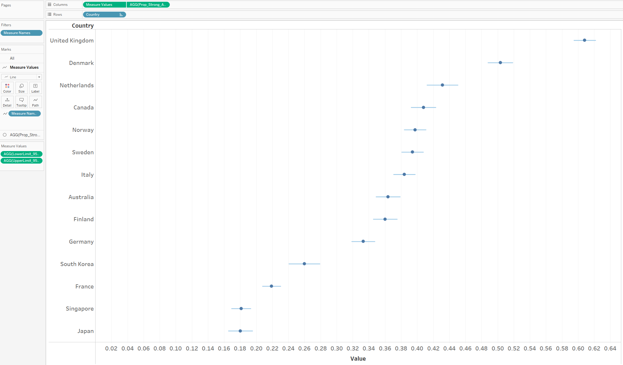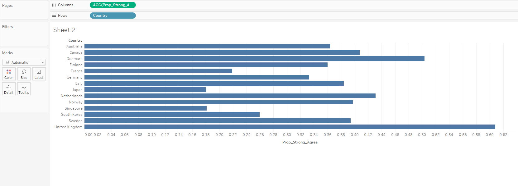 Drag “Prop_Strong_Agree” field to Columns and “Country” to Rows: