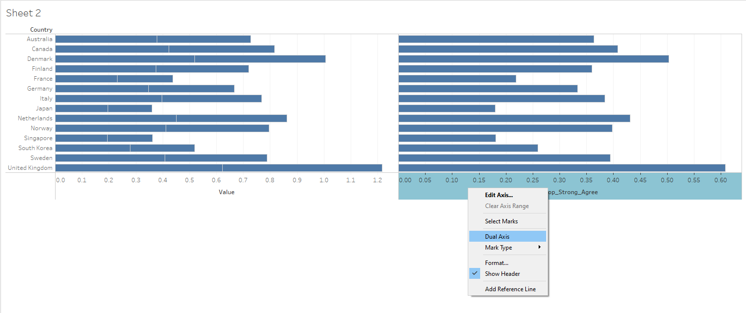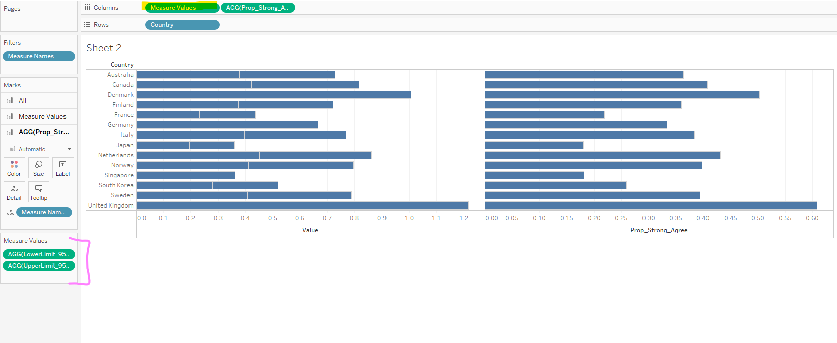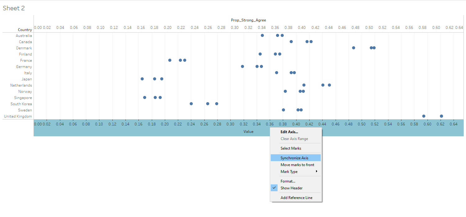 Drag “Prop_Strong_Agree” field to Columns and “Country” to Rows: