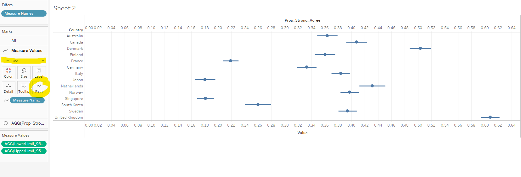 Switch the “Measure Names” under “AGG_Prop_Strong_Agree” mark to Color. Then, adjust the thickness of the line and the size of the circle for both “AGG_Prop_Strong_Agree” and “Measure Values”marks: