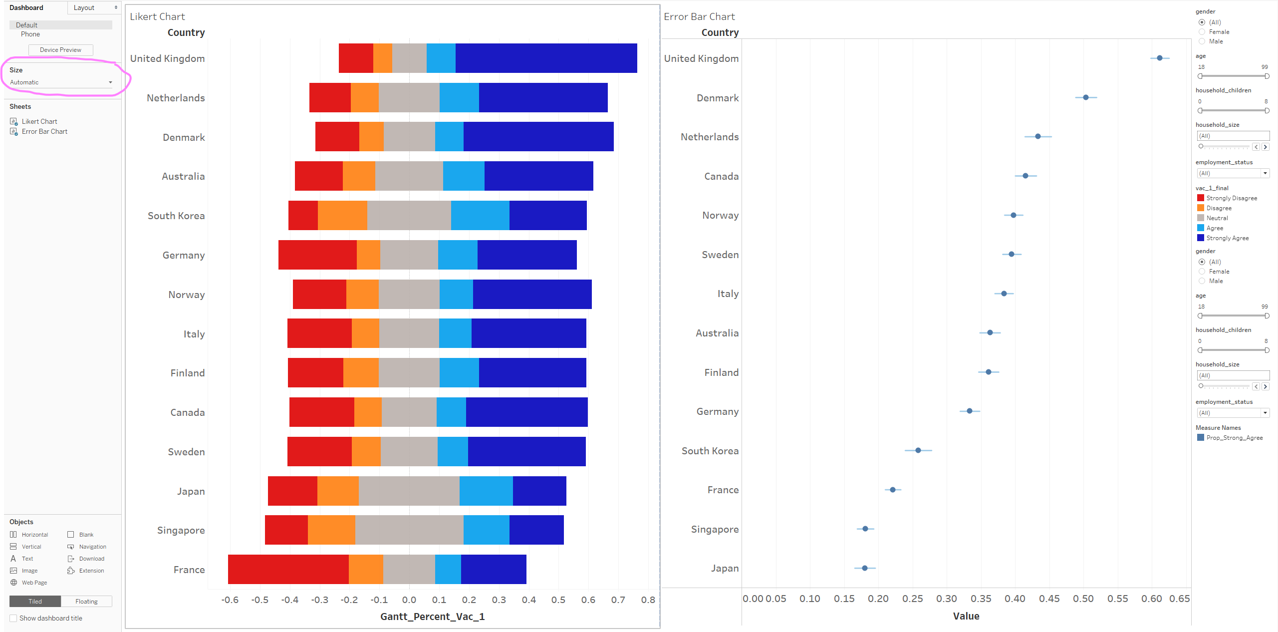 Start a new Dashboard tab, set the Size to “Automatic” and drag in both charts into the workspace: