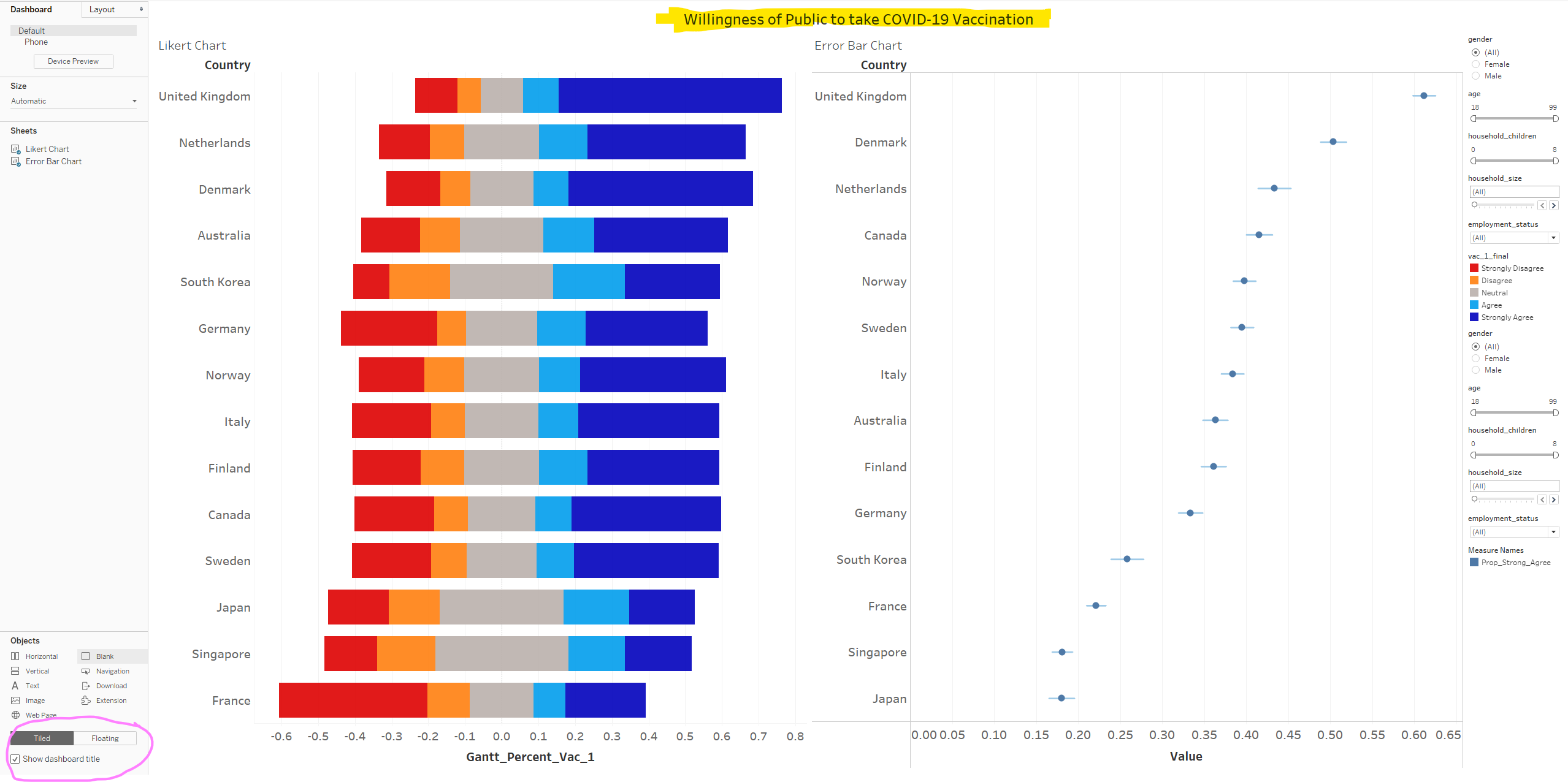 Click on “Show Dashboard Title” at the bottom left, and add the title “Willingness of Public to take COVID-19 Vaccination”