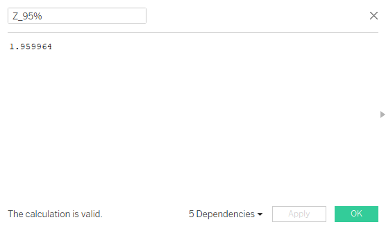 Z_95% - We will be creating 95% Confidence Intervals in this visualization, therefore we need to store the Z value for 95% C.I: